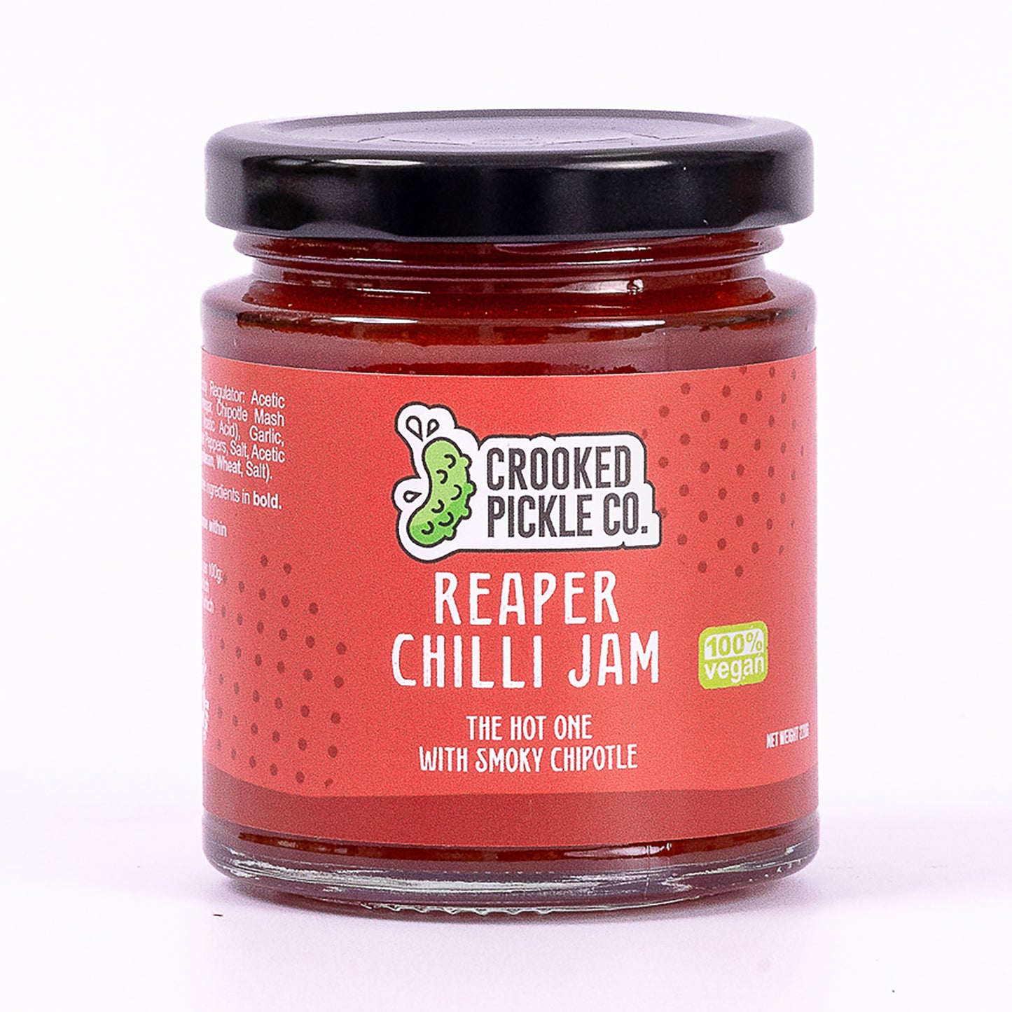 INGREDIENTS: Chopped Tomato (Acidity Regulator: Acetic Acid), Sugar, Red Pepper, Spirit Vinegar, Chipotle Mash (smoked Jalapeno Peppers, Salt, Acetic Acid), Garlic, Carolina Reaper Mash (Carolina Reaper Peppers, Salt, Acetic Acid), Ginger, Soy Sauce (Water, Soyabean, Wheat, Salt).